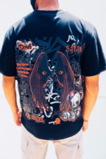 A striking black tee featuring a bold “I am the Devil” print with intricate winged designs, orange accents, and a quirky stitched teddy bear, perfect for an edgy and rebellious style.
