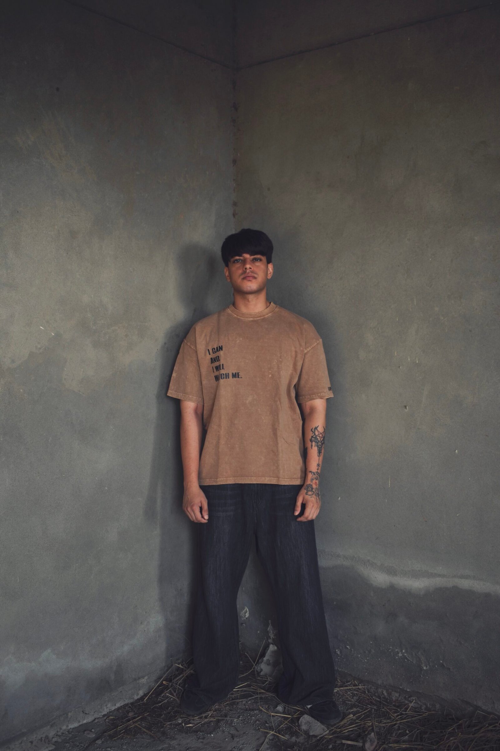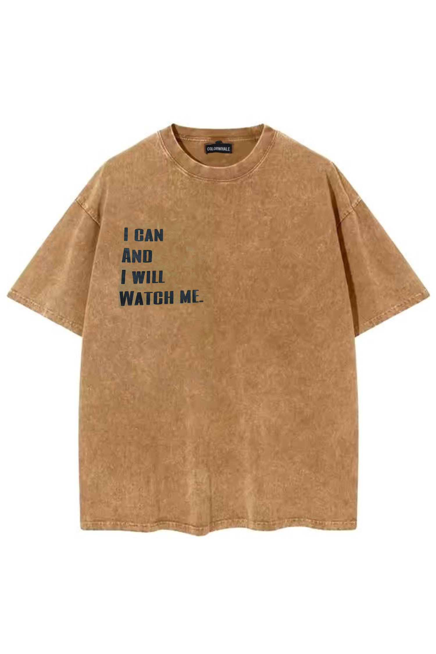 This acid wash tan tee boasts an empowering “I CAN AND I WILL WATCH ME” message on the front and a striking eye-with-hands celestial design on the back, blending motivation with artistic flair.
