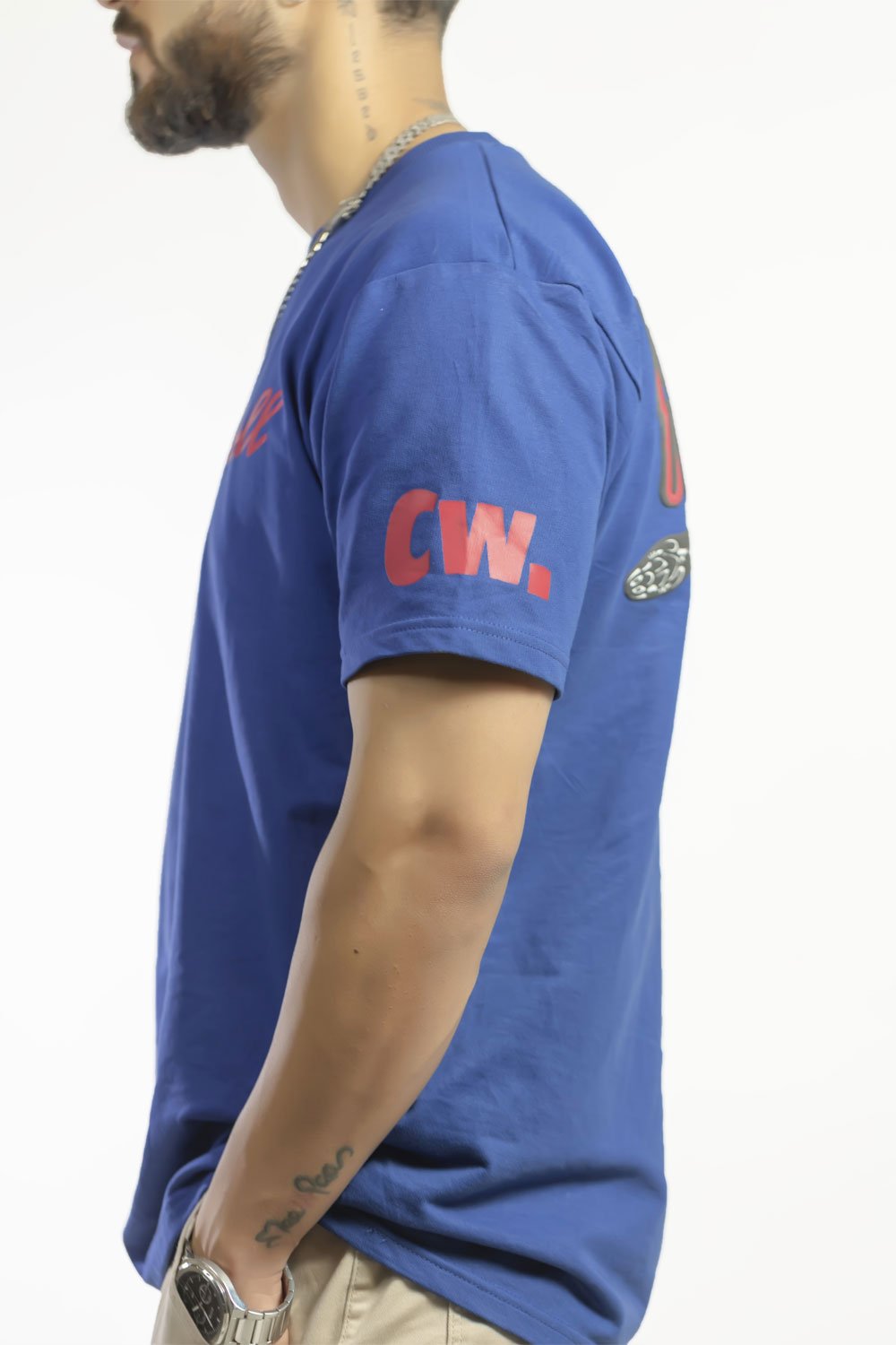 A striking blue tee with a “Color Whale” print featuring a snake graphic in pink and black, perfect for a bold and unique style.