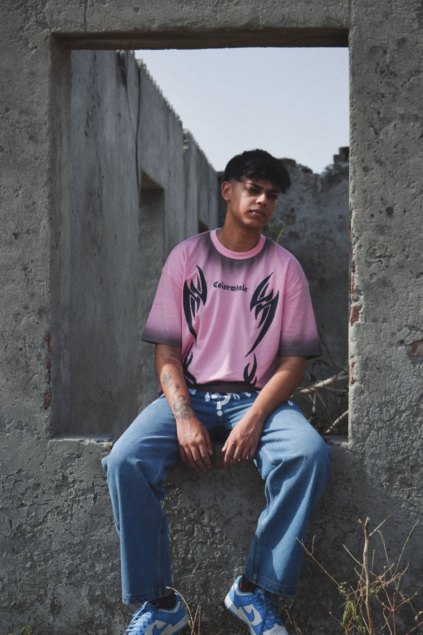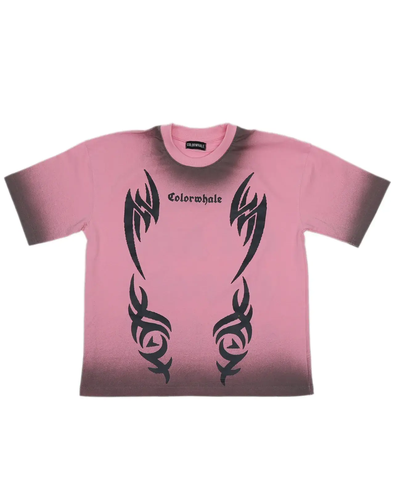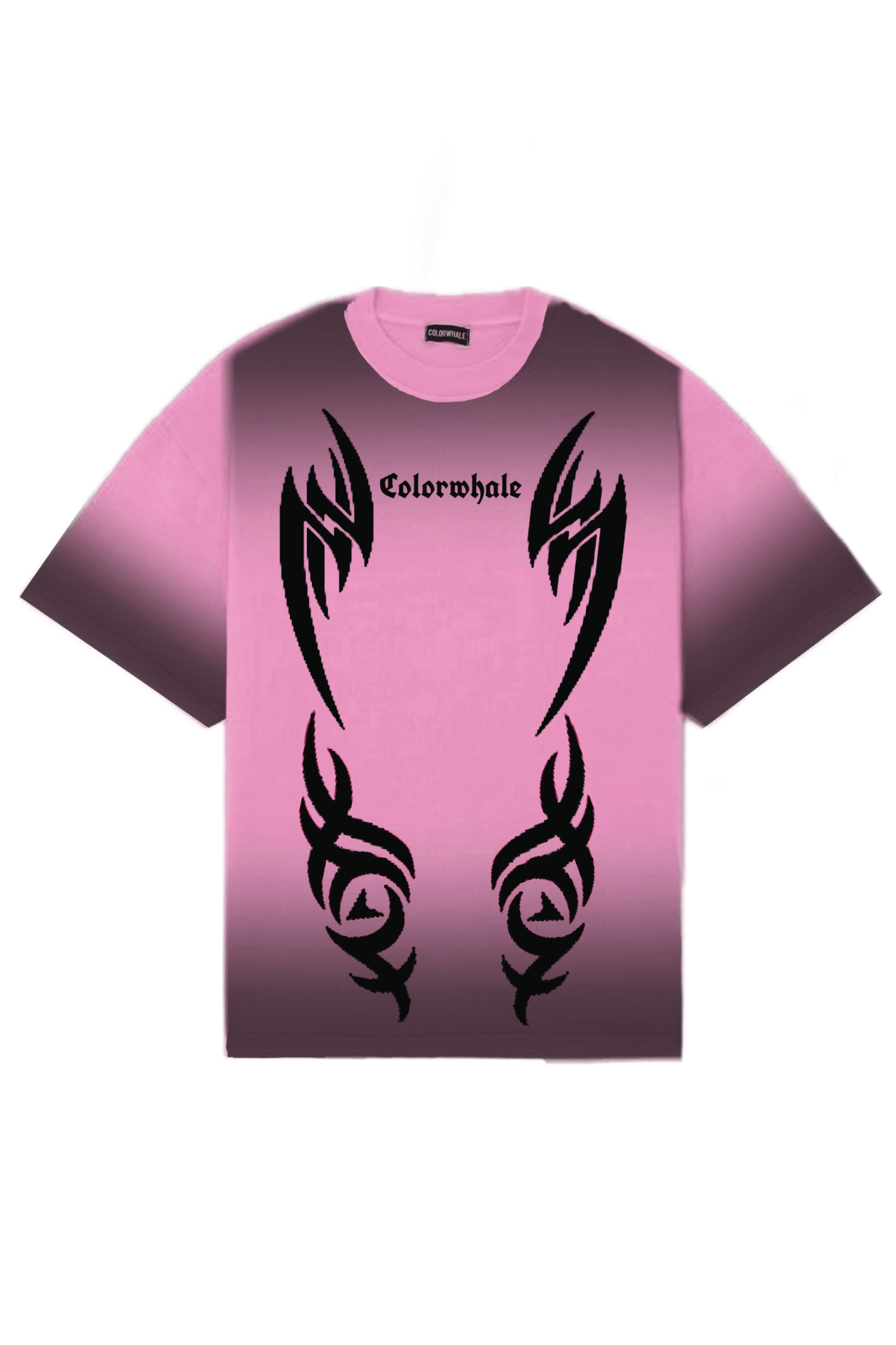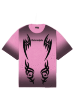 “This pink gradient T-shirt features a bold tribal design on the front, paired with an inspiring “Not all who wander are lost” message on the back, perfect for a stylish, adventurous vibe.