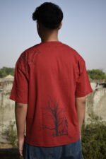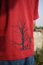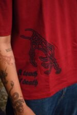 This red tee has a black logo, spider web, and “A touch of death” skeletal hand on the front, with a gothic tree and skeleton design on the back.